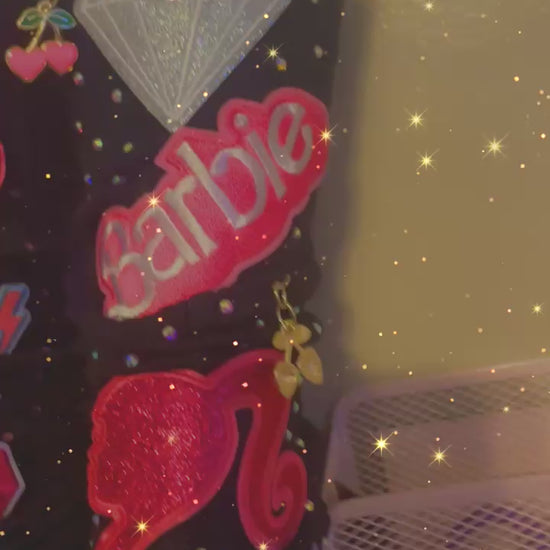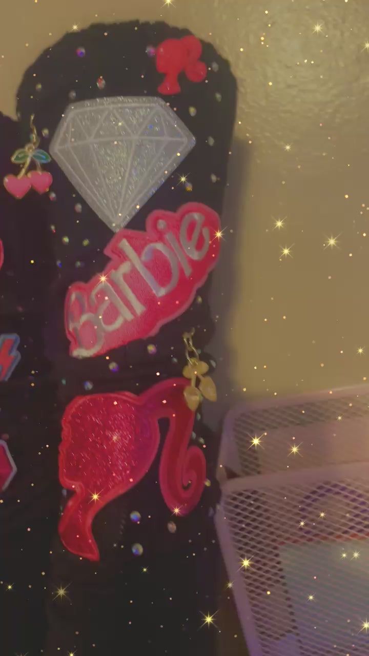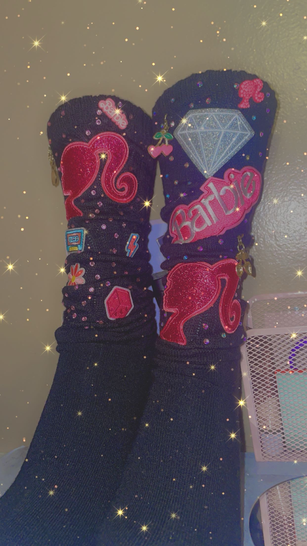 Elevate your style with these Black Slouch Socks inspired by Barbie Tingz. Adorned with vibrant Barbie patches, playful Barbie charms, and dazzling rhinestones, they offer a chic, trendy look while providing all-day comfort. These socks make a bold statement, perfect for showcasing your fun and fashionable side wherever you go.